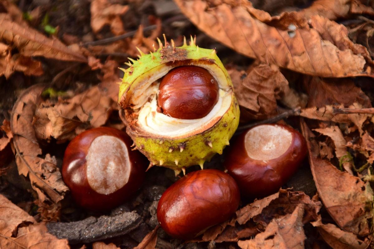 chestnuts on fallen dried leaves