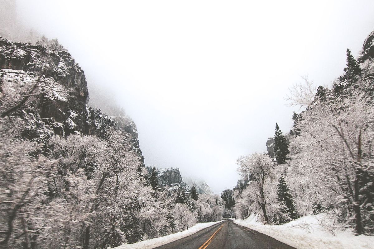 road passing through snow fall area of jungle