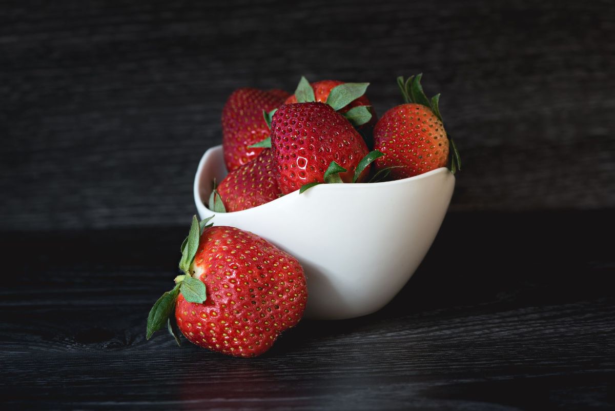 strawberries in white bowl